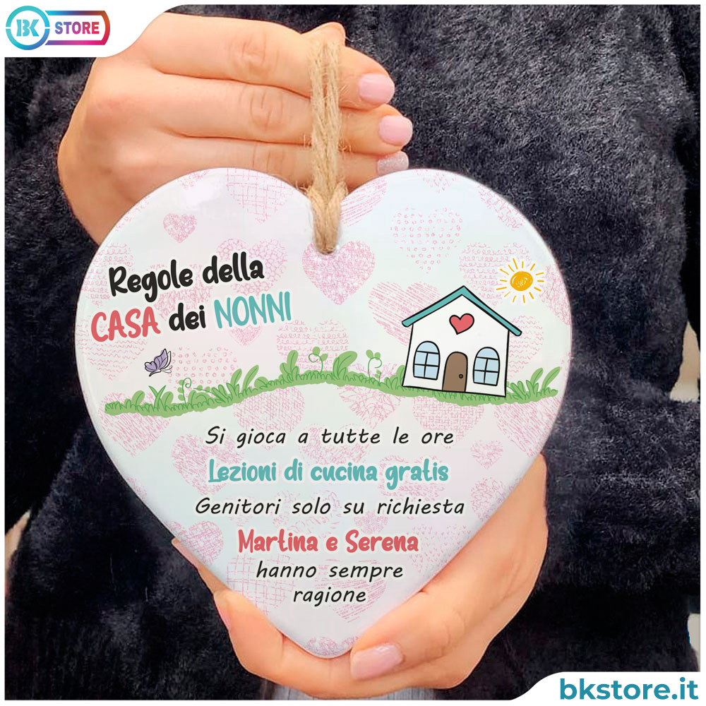 Cerchi un regalo speciale e personalizzato per la festa dei nonni o per ringraziare i nonni? Il nostro cuore in ceramica è la scelta perfetta! Con una simpatica grafica intitolata "Regole della casa dei nonni", questo cuore decorativo celebra con affetto e ironia l’amore e la dolcezza dei nonni. Realizzato in ceramica di alta qualità, è ideale da appendere in casa come ricordo prezioso. Perfetto come pensiero originale e affettuoso, viene spedito con la sua elegante scatola regalo, pronto per essere donato. Un modo unico per dire "grazie" ai nonni e farli sorridere con un regalo che scalda il cuore. Ordina ora il tuo cuore in ceramica e rendi speciale la loro giornata!