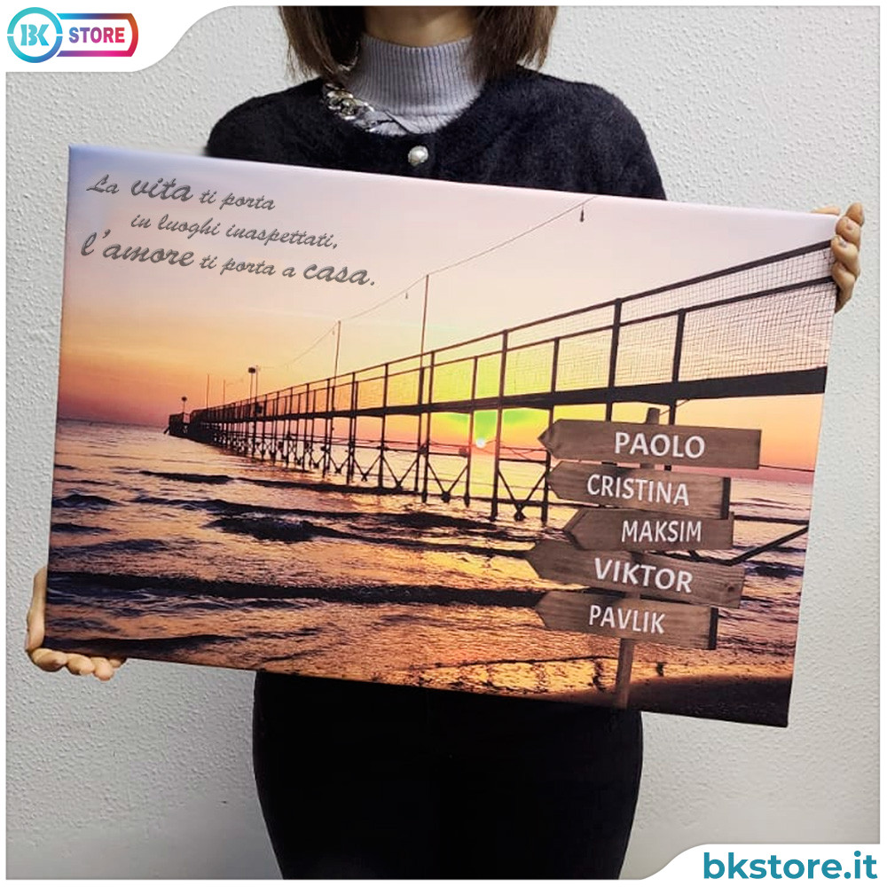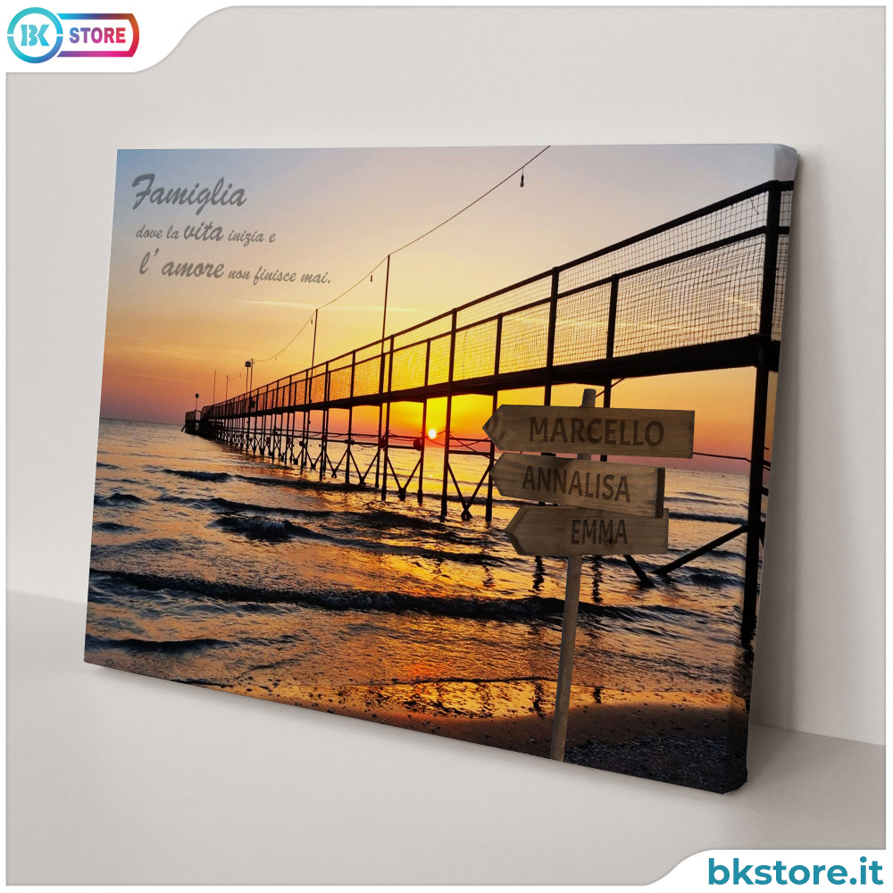Quadro famiglia con nomi su cartelli, frase e alba sul mare personalizzato per la famiglia