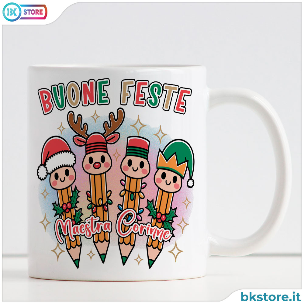 Regalo Natale maestra o maestro: una tazza personalizzata che parla al cuore e celebra il valore dell’insegnamento. Questa tazza in ceramica, decorata con una grafica natalizia allegra con matite colorate, è pensata per portare calore e gratitudine nelle giornate della maestra o maestro. Sul retro è possibile aggiungere i nomi dei bambini, trasformandola in un ricordo unico dell’anno scolastico. Robusta e piacevole da usare per tè, tisane o caffè, arriva già completa della sua elegante scatolina regalo, pronta per essere donata senza ulteriori preparativi. Un’idea semplice ma speciale, perfetta per esprimere affetto e riconoscenza durante le festività natalizie.