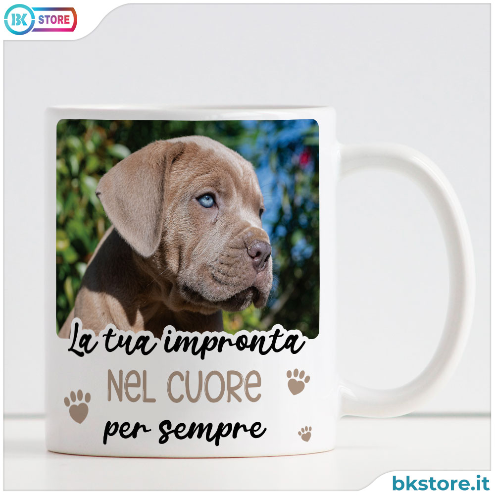 Questa tazza con foto di cane o gatto e la dedica “La tua/la vostra impronta nel cuore per sempre” è pensata per chi ama profondamente il proprio animale domestico. Un oggetto che accompagna i momenti quotidiani, dalla colazione alla pausa caffè. Sul retro è possibile inserire il nome del cane o gatto o una dedica personale, rendendo la tazza unica e significativa. Perfetta come idea regalo per amanti dei cani e gatti, è ideale per celebrare un legame speciale o conservare per sempre il ricordo di un amico fedele. Tazza a tema cane gatto che unisce utilità, design e amore autentico, dedicata a tutti i pet lover che desiderano portare nel cuore, ogni giorno, la propria impronta speciale
