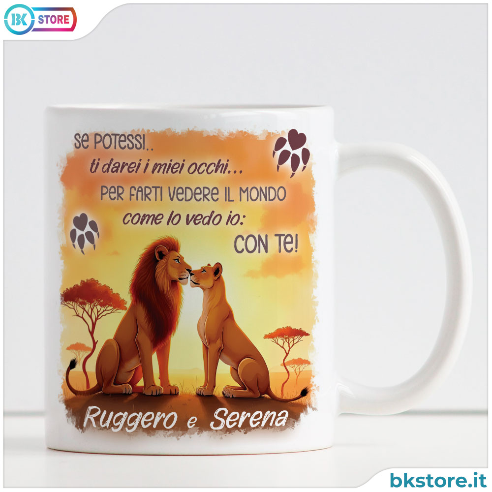 Idea regalo per San Valentino, compleanno, anniversario sorprendi chi ami con una tazza che parla al cuore. Con l’immagine del leone e della leonessa e la scritta “Se potessi, ti darei i miei occhi, per farti vedere il mondo come lo vedo io: con te”, questa tazza è più di un semplice oggetto: è un gesto d’amore, un ricordo quotidiano di quanto la vostra connessione renda speciale ogni momento insieme. Ogni sorso diventa un’occasione per pensare a chi si ama, per condividere sorrisi, abbracci e piccoli gesti di affetto. Perfetta per coppie romantiche, appassionate o semplicemente innamorate della vita insieme, questa tazza trasforma ogni pausa in un momento di tenerezza e complicità. Materiale ceramica, lavabile in lavastoviglie e si può mettere in microonde. Spedita nella scatolina regalo