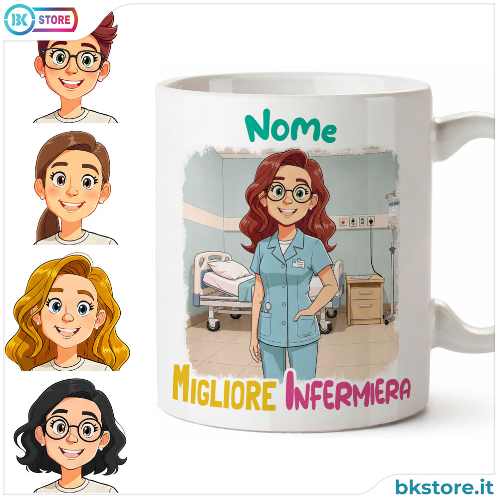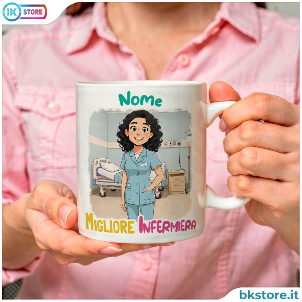 Tazza per infermiera personalizzata con avatar e nome, perfetta come idea regalo originale. Crea il personaggio scegliendo le caratteristiche, aggiungi il nome e rendi unica la tua tazza dedicata alla professione infermieristica. Realizzata in ceramica, è adatta per caffè, tè e bevande calde. Ideale come regalo per compleanno o per ringraziare un’infermiera speciale con un gadget personalizzato.
