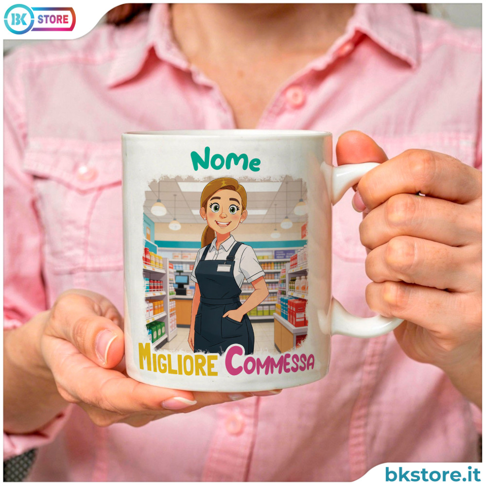 Sul retro della tazza è possibile aggiungere una dedica, il nome del negozio o una frase simpatica a tema lavoro. Realizzata in ceramica di alta qualità, con stampa brillante e resistente ai lavaggi, è un regalo personalizzato originale e pratico, perfetto per commesse che meritano un pensiero speciale.
