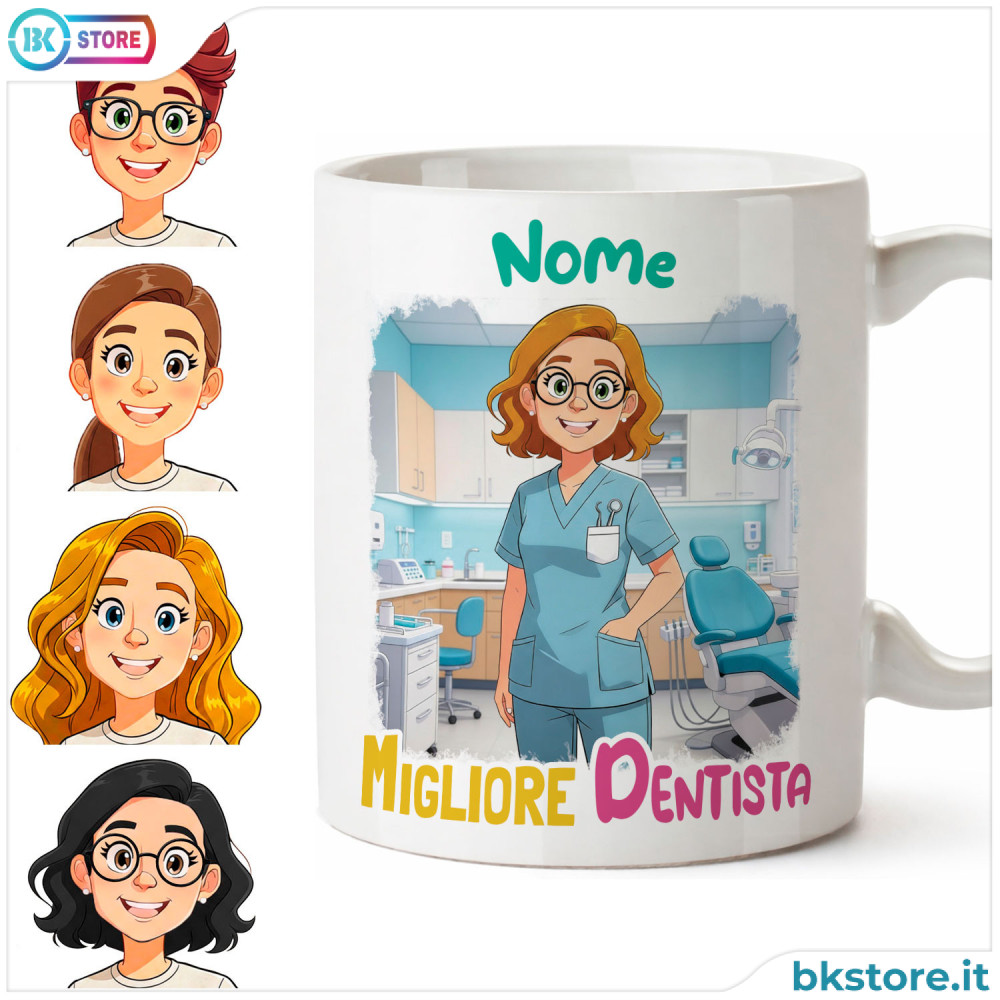 Personalizzabile con avatar, questa tazza dentista in ceramica è il regalo perfetto per medici odontoiatri, igienisti dentali o chi lavora nello studio dentistico. Ideale per compleanno, Natale o come gesto di ringraziamento, rende speciale ogni pausa caffè tra visite e trattamenti. Puoi creare un avatar su misura scegliendo pettinatura, colore dei capelli, occhi, occhiali e inserire il nome del dentista per un regalo unico e personale.